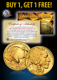 Buy one and get one FREE! Here is your chance to own a 24 Karat Gold Plated non-monetary, copy 2014 American Buffalo coin. This high-quality, privately minted coin has been plated in Genuine 24 Karat Gold by the Merrick Mint to highlight the coin’s design using a unique authentic process. The result is an everlasting 24KT Gold Plated coin collectible of ultra-high quality that is #1 in the industry. Each coin comes in a premium coin capsule with a Certificate of Authenticity. American Indian Head design on the obverse and American Bison design on the reverse.