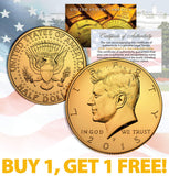 Buy one and get one FREE! Here is your chance to own the 24KT Gold Plated 2015 JFK Kennedy Half Dollar U.S. coin. Each coin is 24KT Gold Plated by the Merrick Mint to highlight the original design using a unique authentic process. The result is an everlasting 24KT Gold Plated coin collectible of ultra-high quality that is #1 in the industry. Each coin features the left portrait of John F. Kennedy design on the obverse and a modified presidential seal design on the reverse. Each coin is genuine legal tender of the United States and comes in an acrylic coin holder and includes a Full Color 2-sided Certificate of Authenticity. The 2015 Kennedy half dollar is a U.S. fifty cent coin with coin mint marks chosen at random.