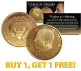 Buy one and get one FREE! Here is your chance to own or gift a 24KT Gold Plated non-monetary 2009 BARACK OBAMA Tribute coin, privately minted by the Merrick Mint. This 24KT Gold Plated tribute coin boasts great detail and is a lifetime keepsake. Each coin comes in a coin capsule with a Certificate of Authenticity. The coin is designed similar to the JFK Kennedy Half Dollar featuring a left portrait of Barack Obama design on the obverse and a modified presidential seal design on the reverse.