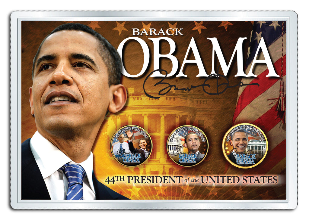 This “BARACK OBAMA – RENEWING AMERICA’S PROMISE” 3-Coin Set is a treasured collectible. Each genuine legal tender U.S. coin has been layered in genuine 24 Karat Gold, and then colorized on the obverse with beautiful images of President Barack Obama. The 3-coin set includes: a “BARACK OBAMA - ELECTED NOVEMBER 4, 2009” Hawaii 2008 State Quarter U.S. coin, a “BARACK OBAMA - INAUGURATION JANUARY 20, 2009” Washington D.C. 2009 Quarter U.S. coin, and a “BARACK OBAMA - 44th PRESIDENT OF THE UNITED STATES” Inaugural George Washington 2007 Presidential $1 U.S. coin. Colorizing coins involves the unique application of special inks directly to the surface of a coin that achieves a level of detail, color saturation, and durability that is #1 in the industry. The result is an everlasting colorized coin collectible of ultra-high quality. The 3-Coin Set comes displayed on a die-cut display with beautiful artwork sealed in acrylic airtight case.