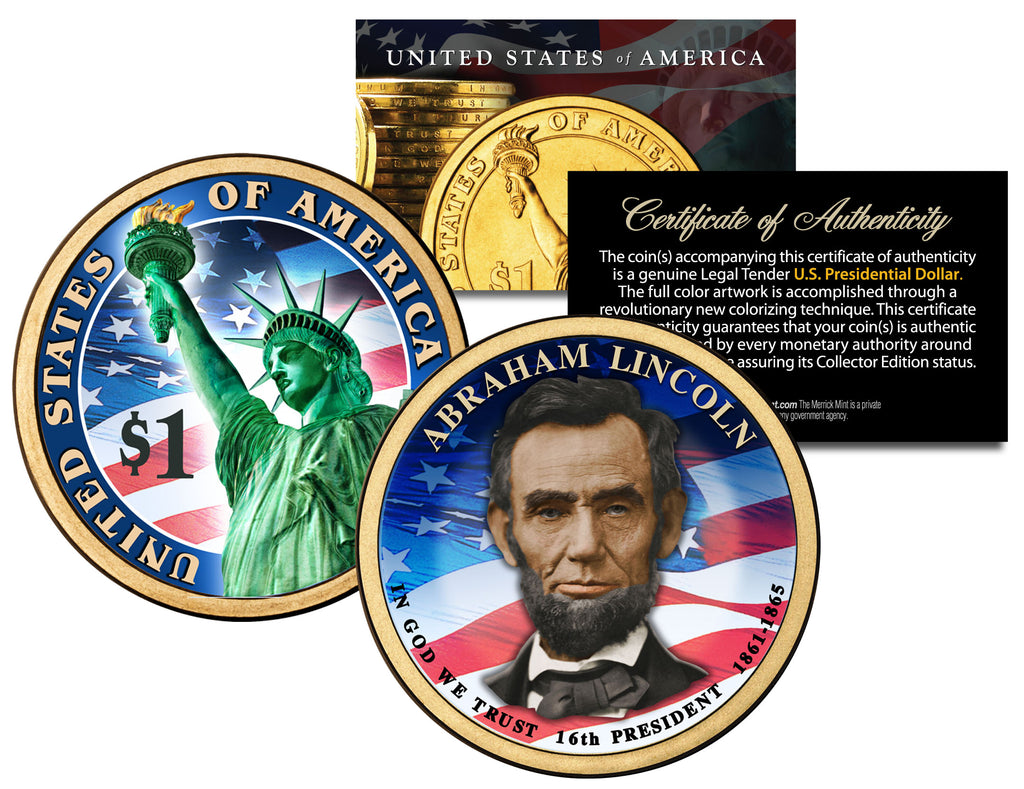 Here is your opportunity to own or to gift the colorized ABRAHAM LINCOLN 2010 Presidential $1 U.S. Coin. To highlight the original design, the Merrick Mint has beautifully colorized both the obverse side and reverse side of the coin. Each coin comes in a premium coin capsule with a full color Certificate of Authenticity to guarantee that your coins are authentic and recognized by every monetary authority around the world, assuring its Collector Edition status. This Legal Tender United States coin has been colorized with an application of special inks directly to the surface of the coin, using a unique and painstakingly multicolor coin process, which achieves a level of detail, color saturation, and durability that is #1 in the coin industry. The result is an everlasting colorized coin collectible of ultra-high quality. The Abraham Lincoln 2010 Presidential $1 U.S. Coin features a Statue of Liberty design on the reverse and an Abraham Lincoln portrait design on the obverse.