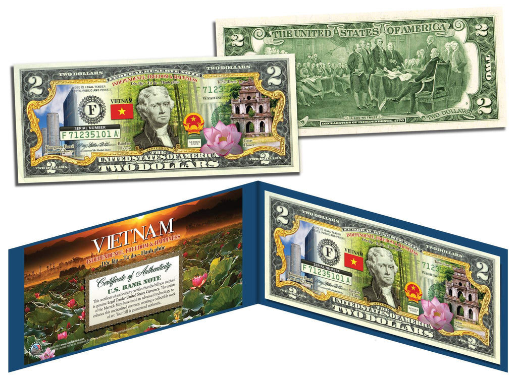 This VIETNAM – INDEPENDENCE, FREEDOM & HAPPINESS uncirculated U.S. $2 Bill is Genuine Authentic Legal Tender of the United States, which has been enhanced with colorized images of Vietnam’s: Turtle Tower, Keangnam Hanoi Landmark Tower, Bamboo Forest, Lotus Flower, National Emblem and Flag. The full colorized images are accomplished through a revolutionary new authentic & genuine colorization process pioneered by The Merrick Mint, creating a collectible work of art. Each bill comes displayed in a blue folio with a Certificate of Authenticity to guarantee that your bills are authentic and recognized by every monetary authority around the world, therefore assuring its Collector Edition status. Each $2 Bill is in FRESH, CRISP, UNCIRCULATED condition, and was directly removed from untouched wrapped Federal Reserve sealed packs. Former U.S. President Thomas Jefferson is featured on the obverse of the note, along with the special colorization overlay. The Signing of the Declaration of Independence by John Trumbull is featured on the reverse. It is the only U.S. Currency note that features two Presidents, John Adams and Thomas Jefferson, and it is one of the most rarely seen BILLS in circulation and actual use.