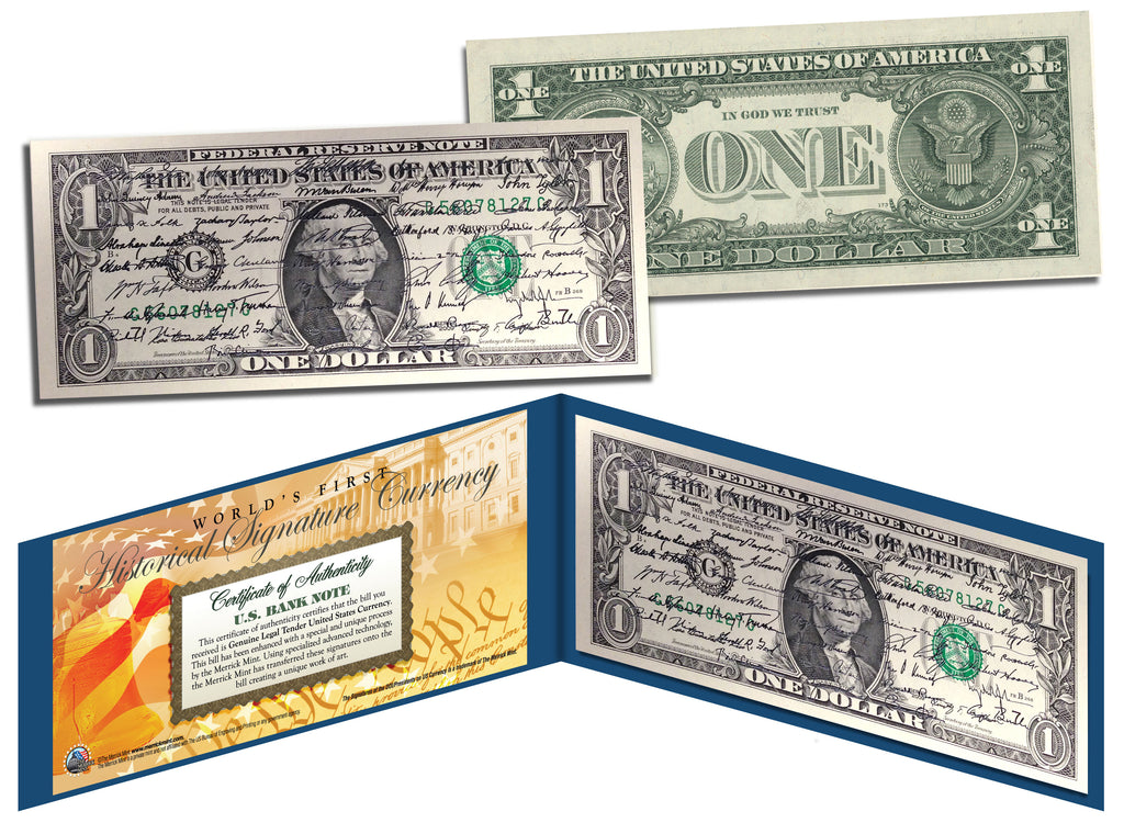 This is your opportunity to own or gift the World’s First Historical Signature Currency $1 US bill. This uncirculated $1 Bill is Genuine Authentic Legal Tender of the United States, which has been beautifully enhanced with the facsimile signatures of the 45 Presidents of the United States. Using specialized advanced technology, the Merrick Mint has permanently transferred the bold-in-black facsimile signatures onto the $1 bill, creating a collectible work of art. Each bill comes displayed in a blue folio with a Certificate of Authenticity to guarantee that your bills are authentic and recognized by every monetary authority around the world, therefore assuring its Collector Edition status. Each $1 Bill is in FRESH, CRISP, UNCIRCULATED condition, and was directly removed from untouched wrapped Federal Reserve sealed packs. The first US President, George Washington, is featured on the obverse of the note, along with the special colorization overlay and the Great Seal of the United States is featured on the reverse.