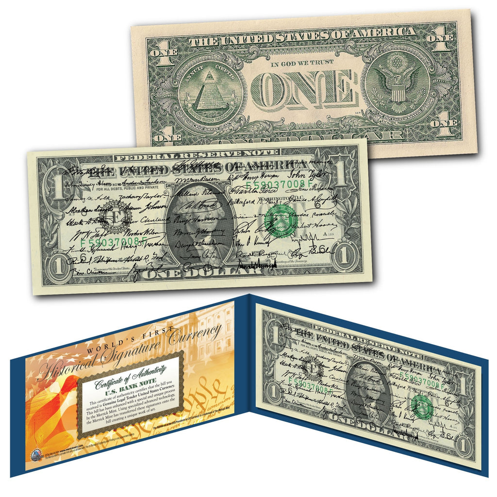 Here is your opportunity to own or gift this Historical Signature Currency $1 US bill. This uncirculated $1 Bill is Genuine Authentic Legal Tender of the United States, which has been beautifully enhanced with the facsimile signatures of the 45 Presidents of the United States. Using specialized advanced technology, the Merrick Mint has permanently transferred the bold-in-black facsimile signatures onto the $1 bill, creating a collectible work of art. Each bill comes displayed in a blue folio with a Certificate of Authenticity to guarantee that your bills are authentic and recognized by every monetary authority around the world, therefore assuring its Collector Edition status. Each $1 Bill is in FRESH, CRISP, UNCIRCULATED condition, and was directly removed from untouched wrapped Federal Reserve sealed packs. The first US President, George Washington, is featured on the obverse of the note, along with the special colorization overlay and the Great Seal of the United States is featured on the reverse.