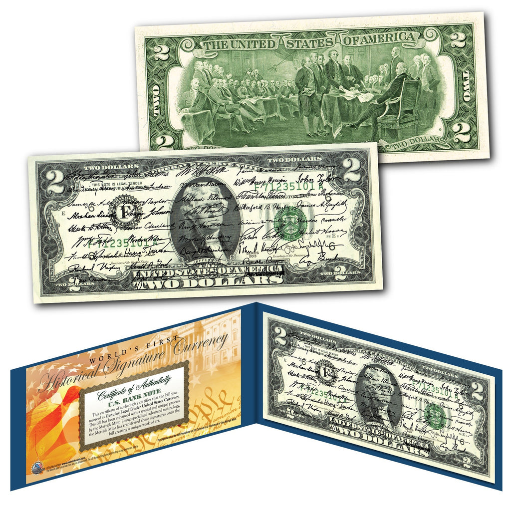 This is your opportunity to own or gift the World’s First Historical Signature Currency $2 US bill. This uncirculated $2 Bill is Genuine Authentic Legal Tender of the United States, which has been beautifully enhanced with the facsimile signatures of the 45 Presidents of the United States. Using specialized advanced technology, the Merrick Mint has permanently transferred the bold-in-black facsimile signatures onto the $2 bill, creating a collectible work of art. Each bill comes displayed in a blue folio with a Certificate of Authenticity to guarantee that your bills are authentic and recognized by every monetary authority around the world, therefore assuring its Collector Edition status. Each $2 Bill is in FRESH, CRISP, UNCIRCULATED condition, and was directly removed from untouched wrapped Federal Reserve sealed packs. Former U.S. President Thomas Jefferson is featured on the obverse of the note, along with the special colorization overlay. The Signing of the Declaration of Independence by John Trumbull is featured on the reverse. It is the only U.S. Currency note that features two Presidents, John Adams and Thomas Jefferson, and it is one of the most rarely seen BILLS in circulation and actual use.