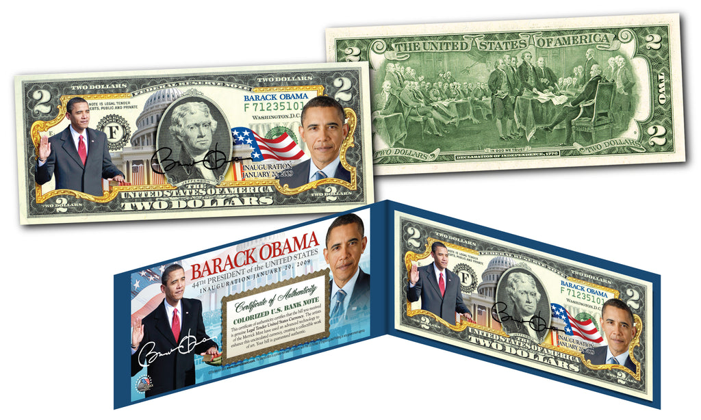 This uncirculated $2 Bill is Genuine Authentic Legal Tender of the United States, which has been enhanced with beautiful colorized images marking the inauguration of Barack Obama as the 44th President of the United States on January 20, 2009. The full colorized images are accomplished through a revolutionary new authentic & genuine colorization process pioneered by The Merrick Mint. Included is a Certificate of Authenticity to guaranty that your bills are authentic and recognized by every monetary authority around the world, and assuring its Collector Edition status. Only genuine Legal Tender $2 United States Bills are used for this unique colorization process. Each $2 Bill is in FRESH, CRISP, UNCIRCULATED condition, and was directly removed from untouched wrapped Federal Reserve sealed packs. Former U.S. President Thomas Jefferson is featured on the obverse of the note, along with the special colorization overlay. The Signing of the Declaration of Independence by John Trumbull is featured on the reverse. It is the only U.S. Currency note that features two Presidents, John Adams and Thomas Jefferson, and it is one of the most rarely seen BILLS in circulation and actual use.