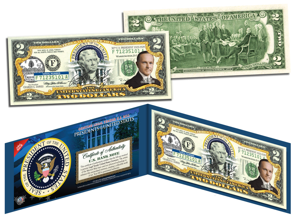The PRESIDENT CALVIN COOLIDGE uncirculated $2 Bill is Genuine Authentic Legal Tender of the United States, which has been enhanced with a beautiful colorized image of the President and the Seal of the State of his birthplace on the obverse of the bill. The full colorized images are accomplished through a revolutionary new authentic & genuine colorization process pioneered by The Merrick Mint. Included is a Certificate of Authenticity to guarantee that your bills are authentic and recognized by every monetary authority around the world, and assuring its Collector Edition status. Each $2 Bill is in FRESH, CRISP, UNCIRCULATED condition, and was directly removed from untouched wrapped Federal Reserve sealed packs. Former U.S. President Thomas Jefferson is featured on the obverse of the note, along with the special colorization overlay. The Signing of the Declaration of Independence by John Trumbull is featured on the reverse. It is the only U.S. Currency note that features two Presidents, John Adams and Thomas Jefferson, and it is one of the most rarely seen BILLS in circulation and actual use.
