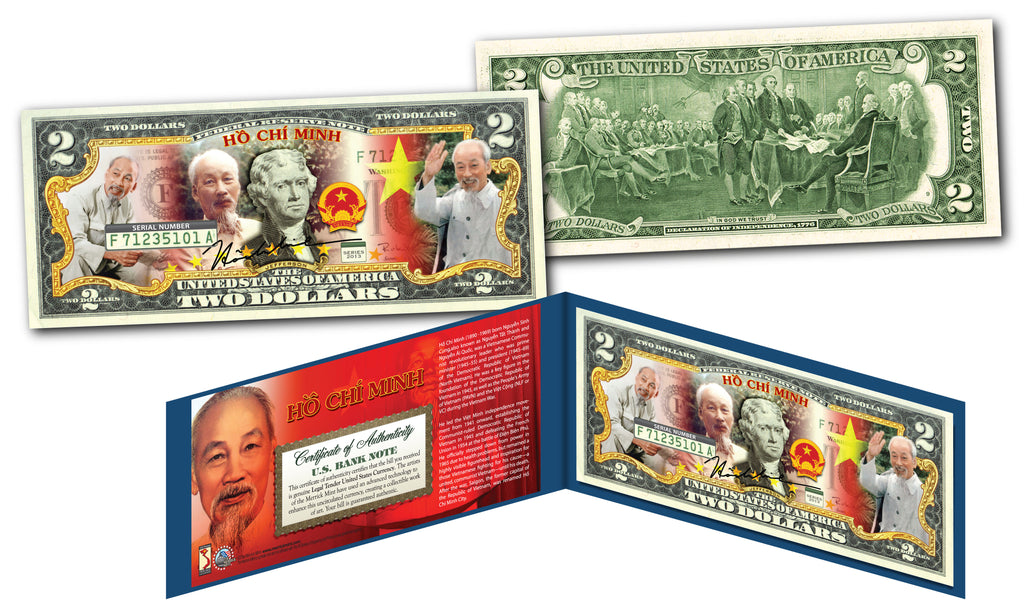 The HO CHI MINH uncirculated $2 Bill is Genuine Authentic Legal Tender of the United States. The full colorized images are accomplished through a revolutionary new authentic & genuine colorization process pioneered by The Merrick Mint. The bill comes displayed in a blue folio with a Certificate of Authenticity to guarantee that your bill is authentic and recognized by every monetary authority around the world, and assuring its Collector Edition status. Each $2 Bill is in FRESH, CRISP, UNCIRCULATED condition, and was directly removed from untouched wrapped Federal Reserve sealed packs. Former U.S. President Thomas Jefferson is featured on the obverse of the note, along with the special colorization overlay. The Signing of the Declaration of Independence by John Trumbull is featured on the reverse. It is the only U.S. Currency note that features two Presidents, John Adams and Thomas Jefferson, and it is one of the most rarely seen BILLS in circulation and actual use.