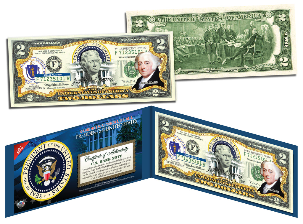 The PRESIDENT JOHN ADAMS uncirculated $2 Bill is Genuine Authentic Legal Tender of the United States, which has been enhanced with a beautiful colorized image of the President and the Seal of the State of his birthplace on the obverse of the bill. The full colorized images are accomplished through a revolutionary new authentic & genuine colorization process pioneered by The Merrick Mint. Included is a Certificate of Authenticity to guarantee that your bills are authentic and recognized by every monetary authority around the world, and assuring its Collector Edition status. Each $2 Bill is in FRESH, CRISP, UNCIRCULATED condition, and was directly removed from untouched wrapped Federal Reserve sealed packs. Former U.S. President Thomas Jefferson is featured on the obverse of the note, along with the special colorization overlay. The Signing of the Declaration of Independence by John Trumbull is featured on the reverse. It is the only U.S. Currency note that features two Presidents, John Adams and Thomas Jefferson, and it is one of the most rarely seen BILLS in circulation and actual use.