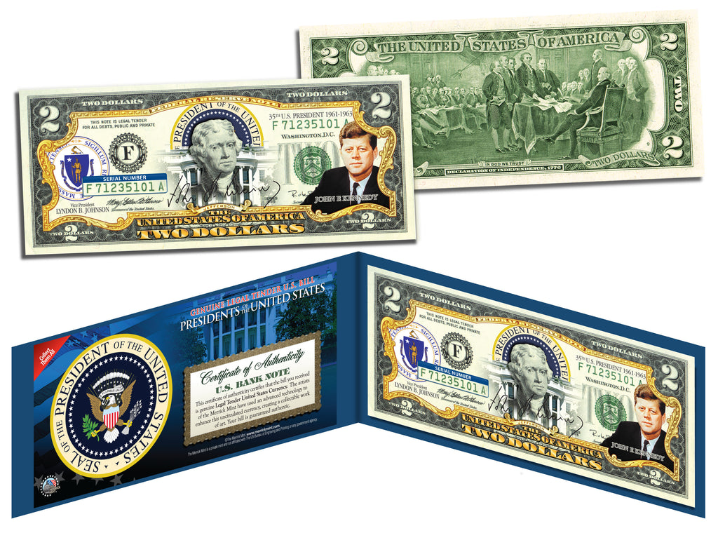 The PRESIDENT JOHN F. KENNEDY uncirculated $2 Bill is Genuine Authentic Legal Tender of the United States, which has been enhanced with a beautiful colorized image of the President and the Seal of the State of his birthplace on the obverse of the bill. The full colorized images are accomplished through a revolutionary new authentic & genuine colorization process pioneered by The Merrick Mint. Included is a Certificate of Authenticity to guarantee that your bills are authentic and recognized by every monetary authority around the world, and assuring its Collector Edition status. Each $2 Bill is in FRESH, CRISP, UNCIRCULATED condition, and was directly removed from untouched wrapped Federal Reserve sealed packs. Former U.S. President Thomas Jefferson is featured on the obverse of the note, along with the special colorization overlay. The Signing of the Declaration of Independence by John Trumbull is featured on the reverse. It is the only U.S. Currency note that features two Presidents, John Adams and Thomas Jefferson, and it is one of the most rarely seen BILLS in circulation and actual use.
