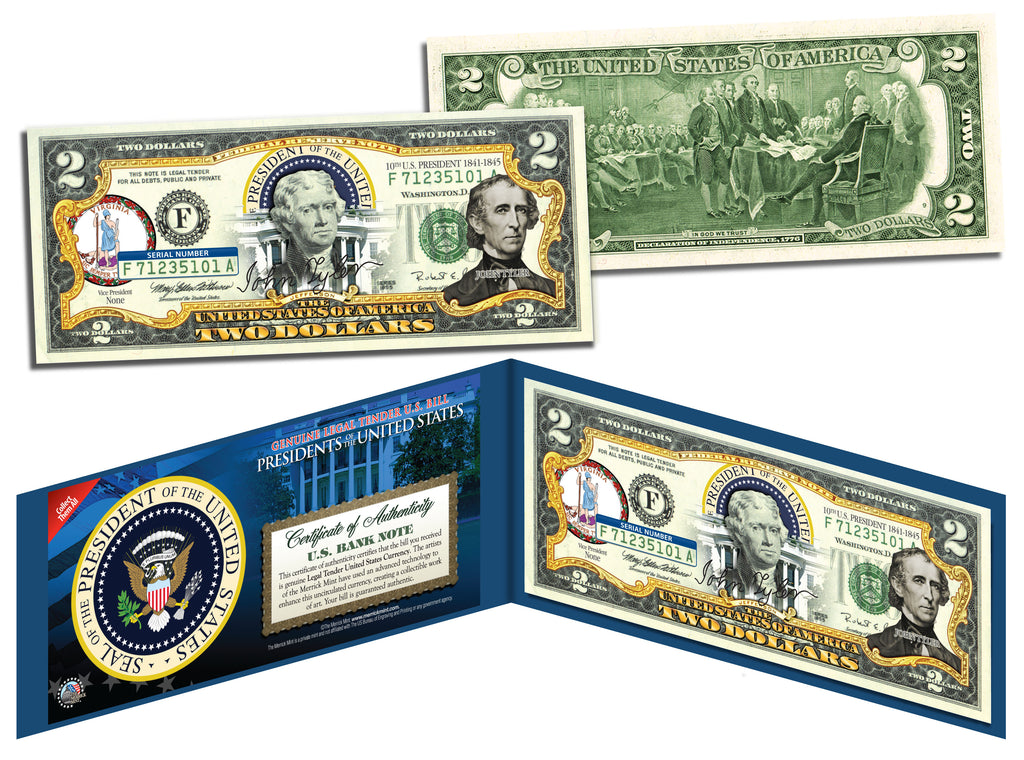The PRESIDENT JOHN TYLER uncirculated $2 Bill is Genuine Authentic Legal Tender of the United States, which has been enhanced with a beautiful colorized image of the President and the Seal of the State of his birthplace on the obverse of the bill. The full colorized images are accomplished through a revolutionary new authentic & genuine colorization process pioneered by The Merrick Mint. Included is a Certificate of Authenticity to guarantee that your bills are authentic and recognized by every monetary authority around the world, and assuring its Collector Edition status. Each $2 Bill is in FRESH, CRISP, UNCIRCULATED condition, and was directly removed from untouched wrapped Federal Reserve sealed packs. Former U.S. President Thomas Jefferson is featured on the obverse of the note, along with the special colorization overlay. The Signing of the Declaration of Independence by John Trumbull is featured on the reverse. It is the only U.S. Currency note that features two Presidents, John Adams and Thomas Jefferson, and it is one of the most rarely seen BILLS in circulation and actual use.