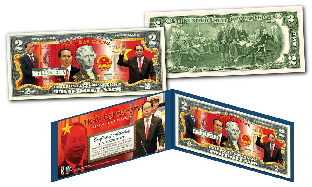 The TRAN DAI QUANG – PRESIDENT OF VIETNAM uncirculated $2 Bill is Genuine Authentic Legal Tender of the United States. The full colorized images are accomplished through a revolutionary new authentic & genuine colorization process pioneered by The Merrick Mint. The bill comes displayed in a blue folio with a Certificate of Authenticity to guarantee that your bill is authentic and recognized by every monetary authority around the world, and assuring its Collector Edition status. Each $2 Bill is in FRESH, CRISP, UNCIRCULATED condition, and was directly removed from untouched wrapped Federal Reserve sealed packs. Former U.S. President Thomas Jefferson is featured on the obverse of the note, along with the special colorization overlay. The Signing of the Declaration of Independence by John Trumbull is featured on the reverse. It is the only U.S. Currency note that features two Presidents, John Adams and Thomas Jefferson, and it is one of the most rarely seen BILLS in circulation and actual use.