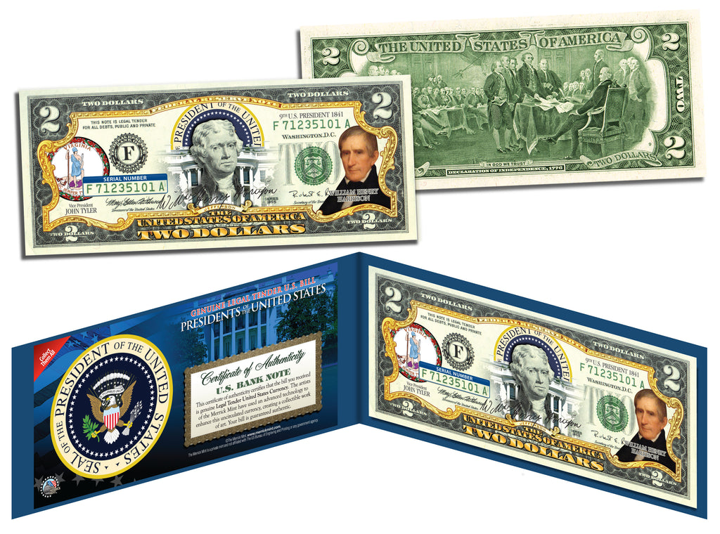 The PRESIDENT WILLIAM HENRY HARRISON uncirculated $2 Bill is Genuine Authentic Legal Tender of the United States, which has been enhanced with a beautiful colorized image of the President and the Seal of the State of his birthplace on the obverse of the bill. The full colorized images are accomplished through a revolutionary new authentic & genuine colorization process pioneered by The Merrick Mint. Included is a Certificate of Authenticity to guarantee that your bills are authentic and recognized by every monetary authority around the world, and assuring its Collector Edition status. Each $2 Bill is in FRESH, CRISP, UNCIRCULATED condition, and was directly removed from untouched wrapped Federal Reserve sealed packs. Former U.S. President Thomas Jefferson is featured on the obverse of the note, along with the special colorization overlay. The Signing of the Declaration of Independence by John Trumbull is featured on the reverse. It is the only U.S. Currency note that features two Presidents, John Adams and Thomas Jefferson, and it is one of the most rarely seen BILLS in circulation and actual use.