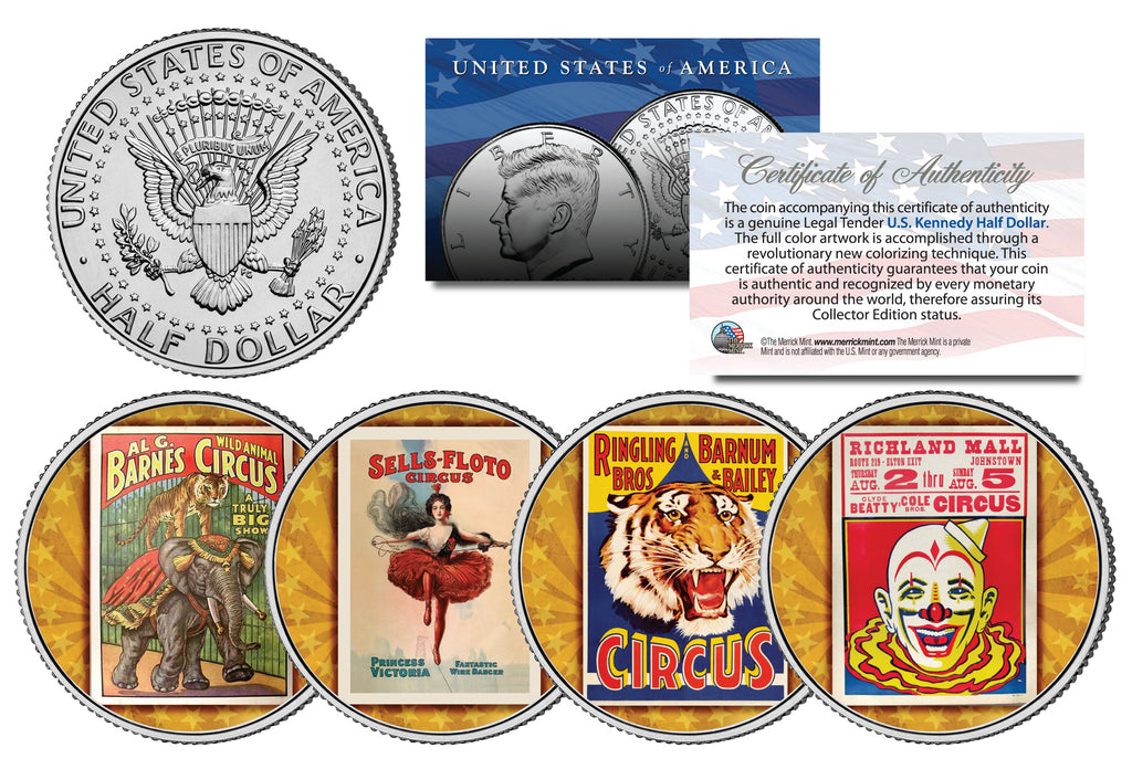Here is your chance to own a complete set of four (4) colorized JFK Kennedy Half Dollar U.S. Coins of RINGLING BROS. AND BARNUM & BAILEY CIRCUS. These high-quality, genuine Legal Tender United States coins have been colorized using a unique painstaking multicolor authentic process by the Merrick Mint. Colorizing coins involves the unique application of special inks directly to the surface of a coin that achieves a level of detail, color saturation, and durability that is #1 in the coin industry. The result is an everlasting colorized coin collectible of ultra-high quality. Each coin comes in a premium coin capsule. The 4-coin set comes with a Certificate of Authenticity to guarantee that your coins are authentic and recognized by every monetary authority around the world, assuring its Collector Edition status. The Kennedy half dollar is a U.S. fifty cent coin with coin year and mint marks chosen at random.