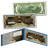 This BANKSY "Devolved Parliament" uncirculated U.S. $2 Bill is Genuine Authentic Legal Tender of the United States, which has been enhanced with beautiful colorized images. "Devolved Parliament" is the largest known canvas by the anonymous street artist known as Banksy, whose controversial creations have earned him global renown. Measuring 13 feet long, it shows the benches of Parliament occupied by primates. The painting was first unveiled in 2009. Then, earlier this year, it returned to the spotlight for another showing in Bristol to mark the date originally intended for Britain's withdrawal from the European Union, March, 29, 2019. At the time, the artist, famed for his dark humor and political commentary, offered the following explanation on Instagram "I made this ten years ago. Bristol museum have just put it back on display to mark Brexit day. "Laugh now, but one day no-one will be in charge." The quote makes reference to the first time Banksy featured chimpanzees in his work. Back in 2002, he produced another large painting of a row of glum-looking chimps in aprons emblazoned with the words: "Laugh now but one day we'll be in charge." The colorized images are accomplished through a revolutionary new authentic & genuine colorization process pioneered by The Merrick Mint, creating a collectible work of art. Each bill comes displayed in a blue folio with a Certificate of Authenticity to guarantee that your bills are authentic and recognized by every monetary authority around the world, therefore assuring its Collector Edition status. Each $2 Bill is in FRESH, CRISP, UNCIRCULATED condition, and was directly removed from untouched wrapped Federal Reserve sealed packs. Former U.S. President Thomas Jefferson is featured on the obverse of the note, along with the special colorization overlay. The Signing of the Declaration of Independence by John Trumbull is featured on the reverse. It is the only U.S. Currency note that features two Presidents, John Adams and Thomas Jefferson, and it is one of the most rarely seen BILLS in circulation and actual use.