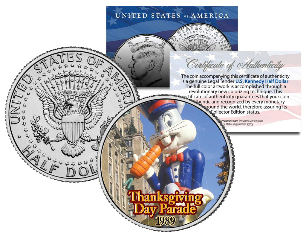 To commemorate Bugs Bunny's 50th anniversary, this 75-foot-tall balloon made its debut in the 1989 parade. Here is your opportunity to own or to gift the BUGS BUNNY BALLOON – 1989 THANKSGIVING DAY PARADE colorized JFK Kennedy Half Dollar U.S. Coin, which has been enhanced with a beautifully colorized image by the Merrick Mint. Each coin comes in a premium coin capsule with a full color Certificate of Authenticity to guarantee that your coin is authentic and recognized by every monetary authority around the world, assuring its Collector Edition status. This Legal Tender United States coin has been colorized with an application of special inks directly to the surface of the coin, using a unique and painstakingly multicolor coin process, which achieves a level of detail, color saturation, and durability that is #1 in the coin industry. The result is an everlasting colorized coin collectible of ultra-high quality. The Kennedy half dollar is a U.S. fifty cent coin with coin year and mint marks chosen at random.
