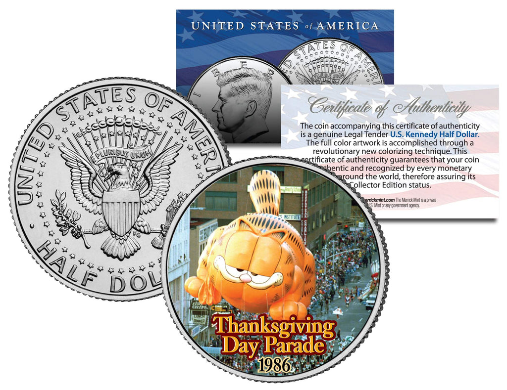 Here is your opportunity to own or to gift the GARFIELD BALLOON – 1986 THANKSGIVING DAY PARADE colorized JFK Kennedy Half Dollar U.S. Coin, which has been enhanced with a beautifully colorized image by the Merrick Mint. Each coin comes in a premium coin capsule with a full color Certificate of Authenticity to guarantee that your coin is authentic and recognized by every monetary authority around the world, assuring its Collector Edition status. This Legal Tender United States coin has been colorized with an application of special inks directly to the surface of the coin, using a unique and painstakingly multicolor coin process, which achieves a level of detail, color saturation, and durability that is #1 in the coin industry. The result is an everlasting colorized coin collectible of ultra-high quality. The Kennedy half dollar is a U.S. fifty cent coin with coin year and mint marks chosen at random.