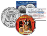 Harry Houdini was an illusionist and stunt performer, noted for his sensational escape acts. Here is your opportunity to own or gift the HARRY HOUDINI – MILK CAN ESCAPE colorized JFK Kennedy Half Dollar U.S. Coin, which has been enhanced with a beautifully colorized image by the Merrick Mint. Each coin comes in a premium coin capsule with a full color Certificate of Authenticity to guarantee that your coin is authentic and recognized by every monetary authority around the world, assuring its Collector Edition status. This Legal Tender United States coin has been colorized with an application of special inks directly to the surface of the coin, using a unique and painstakingly multicolor coin process, which achieves a level of detail, color saturation, and durability that is #1 in the coin industry. The result is an everlasting colorized coin collectible of ultra-high quality. The Kennedy half dollar is a U.S. fifty cent coin with coin year and mint marks chosen at random.