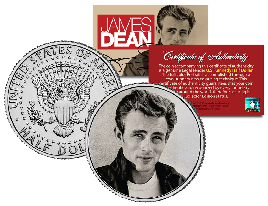 Here is James Dean leaning against a wall on the set of Rebel Without a Cause, a 1955 American drama film, which has achieved landmark status for the acting of cultural icon James Dean in his most celebrated role. This was the only film during Dean's lifetime that he received top billing. This Officially Licensed JAMES DEAN SERIES – REBEL WITHOUT A CAUSE coin is a treasured collectible, combining the popularity of cultural icon, James Dean, with coin collecting. Here is your chance to own a beautifully colorized JFK Kennedy Half Dollar U.S. Coin. This high-quality genuine Legal Tender U.S. coin has been colorized using a unique painstaking multicolor authentic process. Colorizing coins involves the unique application of special inks directly to the surface of a coin that achieves a level of detail, color saturation, and durability that is #1 in the coin industry. The result is an everlasting colorized coin collectible of ultra-high quality. Each coin comes in a premium coin capsule with a Certificate of Authenticity.