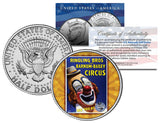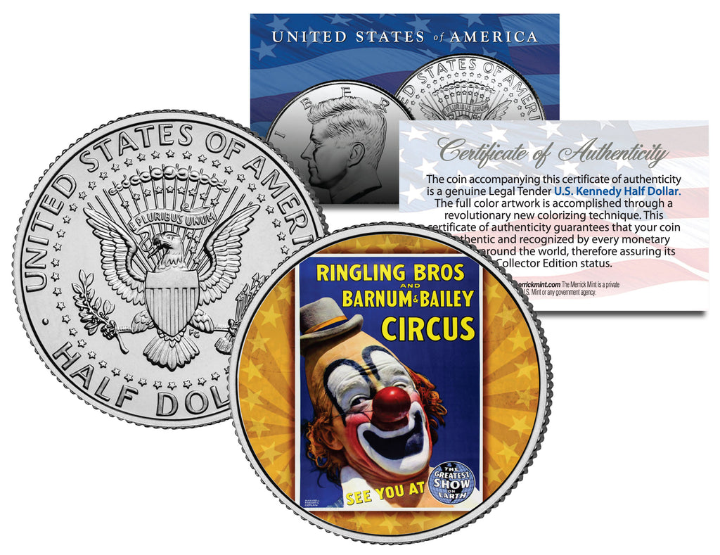 Here is your opportunity to own or gift the RINGLING BROS. AND BARNUM & BAILEY CIRCUS – CLOWN colorized JFK Kennedy Half Dollar U.S. Coin, which has been enhanced with a beautifully colorized image by the Merrick Mint. Each coin comes in a premium coin capsule with a full color Certificate of Authenticity to guarantee that your coin is authentic and recognized by every monetary authority around the world, assuring its Collector Edition status. This Legal Tender United States coin has been colorized with an application of special inks directly to the surface of the coin, using a unique and painstakingly multicolor coin process, which achieves a level of detail, color saturation, and durability that is #1 in the coin industry. The result is an everlasting colorized coin collectible of ultra-high quality. The Kennedy half dollar is a U.S. fifty cent coin with coin year and mint marks chosen at random.