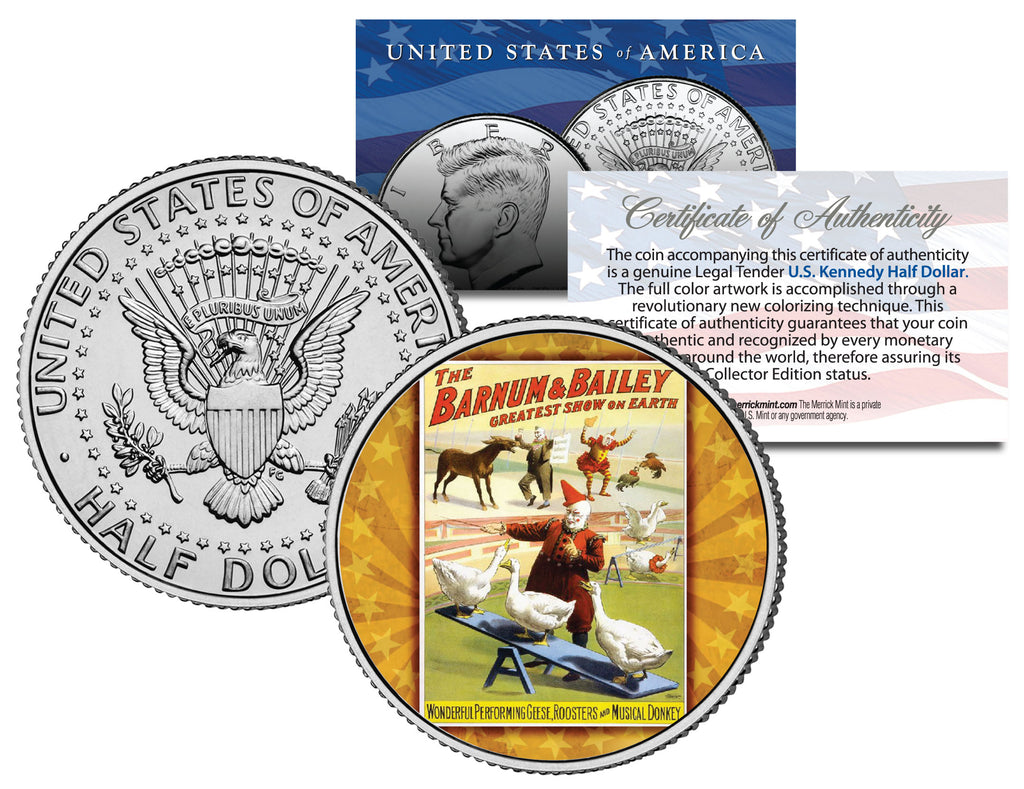 Here is your opportunity to own or gift the RINGLING BROS. AND BARNUM & BAILEY CIRCUS – GEESE colorized JFK Kennedy Half Dollar U.S. Coin, which has been enhanced with a beautifully colorized image by the Merrick Mint. Each coin comes in a premium coin capsule with a full color Certificate of Authenticity to guarantee that your coin is authentic and recognized by every monetary authority around the world, assuring its Collector Edition status. This Legal Tender United States coin has been colorized with an application of special inks directly to the surface of the coin, using a unique and painstakingly multicolor coin process, which achieves a level of detail, color saturation, and durability that is #1 in the coin industry. The result is an everlasting colorized coin collectible of ultra-high quality. The Kennedy half dollar is a U.S. fifty cent coin with coin year and mint marks chosen at random.