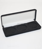 •DELUXE PLUSH BLACK FELT COIN DISPLAY GIFT BOX •Black felt insert holds three (3) encapsulated Ike Dollar/American Silver Eagle in upright or flat position •Black felt outside with white sateen inside top •Sturdy metal hinged frame underneath felt •Quantity: 1 Box •Uses: Gift, Display, Storage, Presentation •Size: Width: 6.25" x Length: 2.25" •Brand new condition •Box comes with white cardboard sleeve •Coins and capsules not included •Made in the U.S.A. •For large orders, contact us for pricing. •FREE SHIPPING!