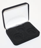 •DELUXE PLUSH BLACK FELT COIN DISPLAY GIFT BOX •Black felt insert holds three (3) encapsulated Quarters/Presidential $1/Sacagawea Dollars in upright or flat position •Black felt outside with white sateen inside top •Sturdy metal hinged frame underneath felt •Quantity: 1 Box •Uses: Gift, Display, Storage, Presentation •Size: Width: 3.5" x Length: 2.75" •Brand new condition •Box comes with white cardboard sleeve •Coins and capsules not included •Made in the U.S.A. •For large orders, contact us for pricing. •FREE SHIPPING!