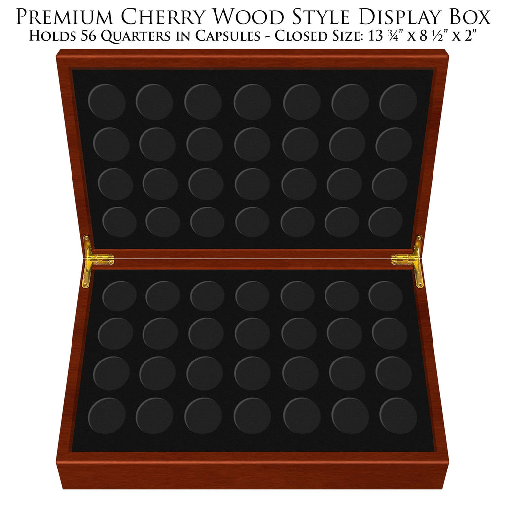 • Deluxe Heirloom Cherry Wood Style Coin Presentation 56-Coin Display Box – Holds Any Coin Capsule with Outside Dimension of 1.25 Inches (24MM)