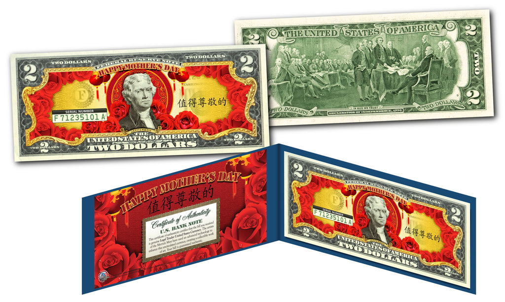 This Mother's Day, give a gift of a $2 Bill, which is enclosed in an attractive blue folio and festively adorned with Chinese symbolism. Amazingly, the artists have used advanced technology to enhance the collectability of this uncirculated currency. These pristine condition $2 bills are a spectacular currency collectible and a unique gift. Due to the painstaking Colorization process, only a limited number of these bills are currently available. Place your order now. They are In-Stock and Shipping immediately. We also ship internationally.