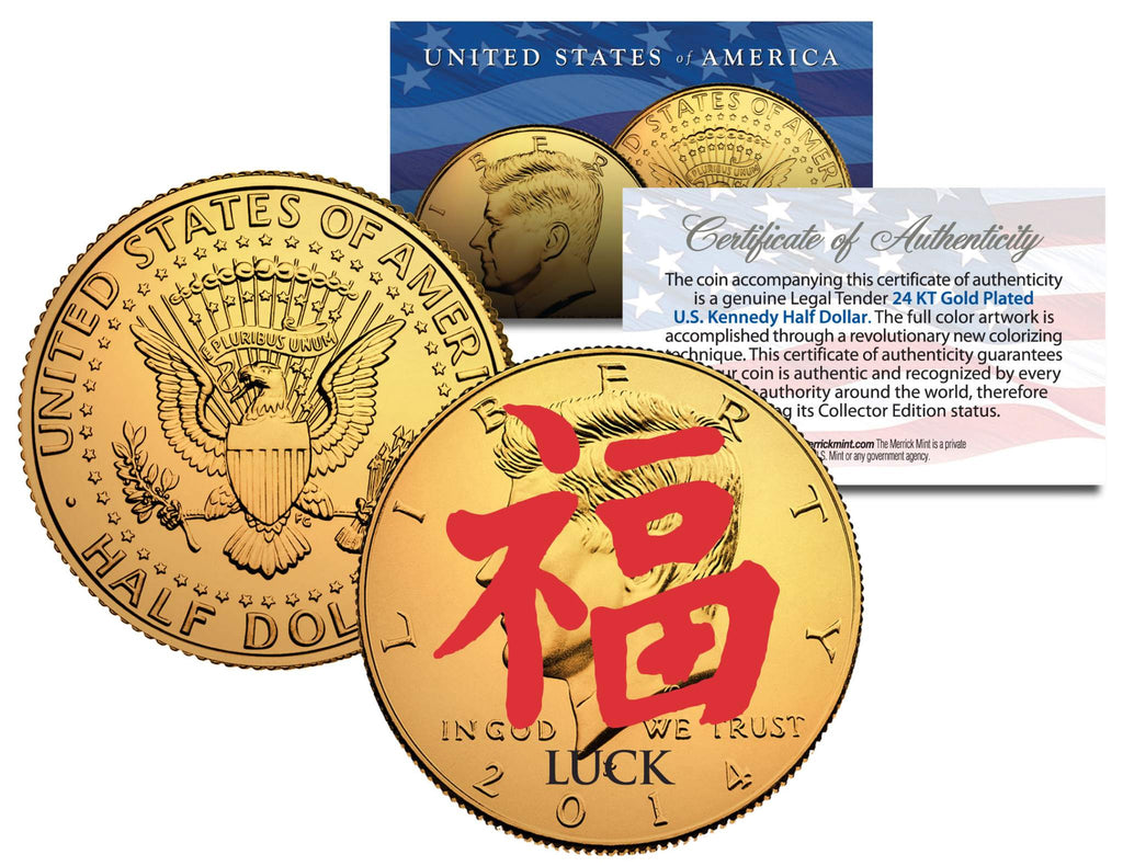 This LUCK – CHINESE SYMBOL coin is a treasured collectible and keepsake. Here is your opportunity to own or to gift, a beautifully colorized JFK Kennedy Half Dollar U.S. Coin, which has been layered in Genuine 24 Karat Gold, and then enhanced with a beautiful colorized image by the Merrick Mint. Each coin comes in a premium coin capsule. This Legal Tender United States coin has been colorized with an application of special inks directly to the surface of the coin, using a unique and painstakingly multicolor coin process, which achieves a level of detail, color saturation, and durability that is #1 in the coin industry. The result is an everlasting colorized coin collectible of ultra-high quality. Each coin comes in a premium coin capsule with a Certificate of Authenticity to guarantee that your coin is authentic and recognized by every monetary authority around the world, assuring its Collector Edition status. The Kennedy half dollar is a U.S. fifty cent coin with coin mint marks chosen at random.