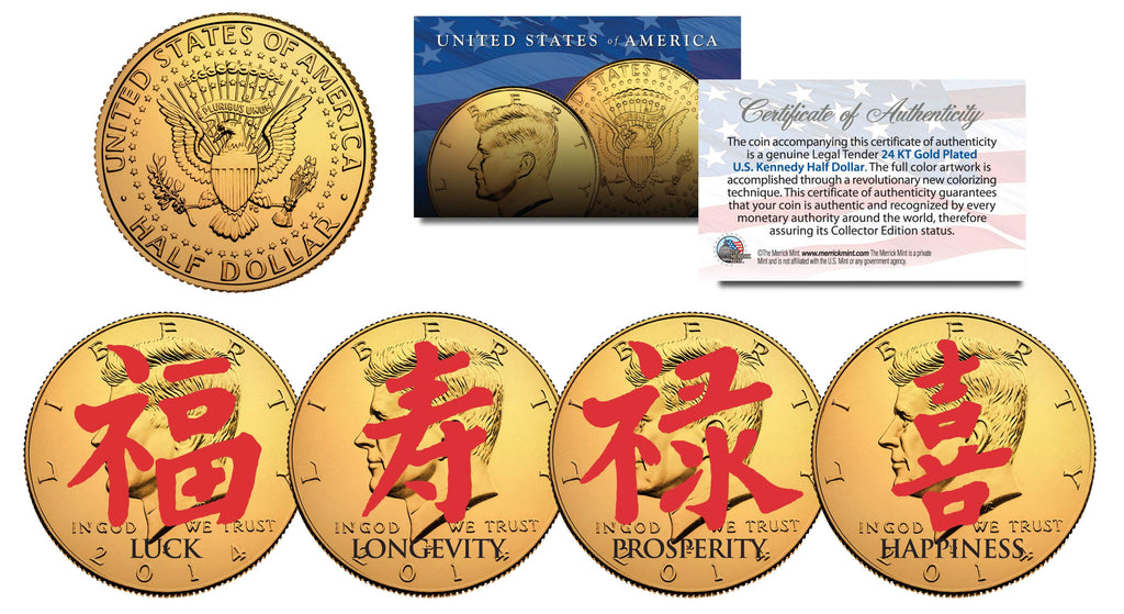 Here is your chance to own the CHINESE SYMBOLS complete set of four (4) 24KT Gold Plated and colorized JFK Kennedy Half Dollars U.S. Coins including: Luck, Longevity, Prosperity and Happiness. These high-quality, genuine Legal Tender United States coins have been layered in Genuine 24 Karat Gold, and then colorized using a unique painstaking multicolor authentic process by the Merrick Mint. Each coin comes in a premium coin capsule. The 4-coin set comes with a Certificate of Authenticity to guarantee that your coins are authentic and recognized by every monetary authority around the world, assuring its Collector Edition status. Colorizing coins involves the unique application of special inks directly to the surface of a coin that achieves a level of detail, color saturation, and durability that is #1 in the coin industry. The result is an everlasting colorized coin collectible of ultra-high quality. The Kennedy half dollar is a U.S. fifty cent coin with coin year and mint marks chosen at random.