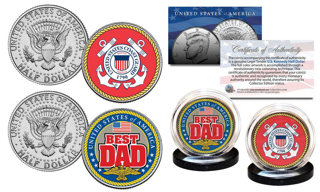 This is a great gift for your Dad to proudly display and makes a great Fathers Day gift! This 2-coin set includes a beautifully colorized “BEST DAD” JFK Kennedy Half Dollar and a beautifully colorized official COAST GUARD Logo JFK Kennedy Half Dollar. Each coin comes in a premium coin capsule with a coin display stand. Included is a Certificate of Authenticity to guarantee that your coins are authentic and recognized by every monetary authority around the world, assuring its Collector Edition status. These Genuine Legal Tender United States coins have been colorized using a unique painstaking multi-color authentic process by the Merrick Mint. Colorizing coins involves the unique application of special inks directly to the surface of a coin that achieves a level of detail, color saturation, and durability that is #1 in the coin industry. The result is an everlasting colorized coin collectible of ultra-high quality. Celebrate Fathers day with these Unique Coins. Make Dad Proud!