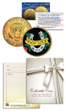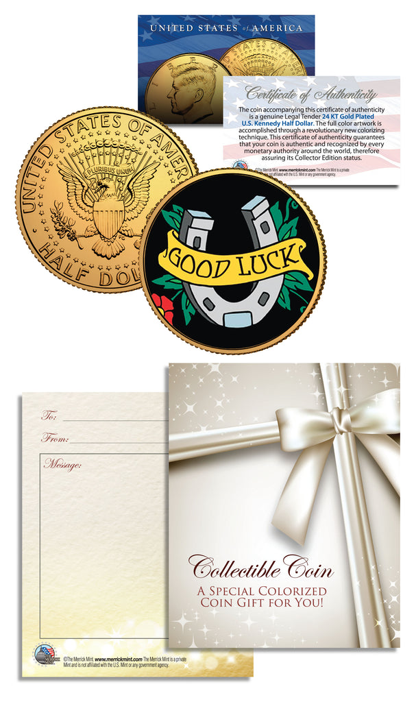 This GOOD LUCK HORSESHOE - LUCKY COIN is a good luck charm and treasured collectible. Here is your chance to own or gift a beautifully colorized 24KT Gold Plated JFK Kennedy Half Dollar U.S. Coin. This high-quality genuine Legal Tender U.S. coin has been has been layered in Genuine 24 Karat Gold, and then enhanced with beautiful colorized images using a unique painstaking multicolor authentic process. Colorizing coins involves the unique application of special inks directly to the surface of a coin that achieves a level of detail, color saturation, and durability that is #1 in the coin industry. The result is an everlasting colorized coin collectible of ultra-high quality. Each coin comes in a premium coin capsule with a Certificate of Authenticity to guaranty that your coin is authentic and recognized by every monetary authority around the world, assuring its Collector Edition status. As a bonus, you will also receive an attractive, handy Gift Message Card for you to personalize when giving the coin as a gift.