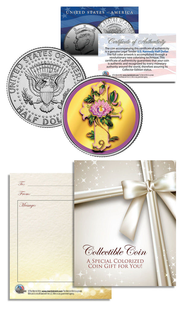 Religious Cross for Baptism Communion - Keepsake Gift JFK Kennedy Half Dollar US Colorized Coin