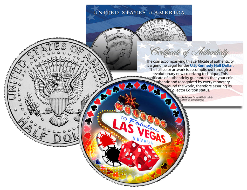 Here is your opportunity to own or gift the LAS VEGAS colorized JFK Kennedy Half Dollar U.S. Coin, which has been enhanced with a beautifully colorized image by the Merrick Mint. Each coin comes in a premium coin capsule with a full color Certificate of Authenticity to guarantee that your coin is authentic and recognized by every monetary authority around the world, assuring its Collector Edition status. This Legal Tender United States coin has been colorized with an application of special inks directly to the surface of the coin, using a unique and painstakingly multicolor coin process, which achieves a level of detail, color saturation, and durability that is #1 in the coin industry. The result is an everlasting colorized coin collectible of ultra-high quality. The Kennedy half dollar is a U.S. fifty cent coin with coin year and mint marks chosen at random.