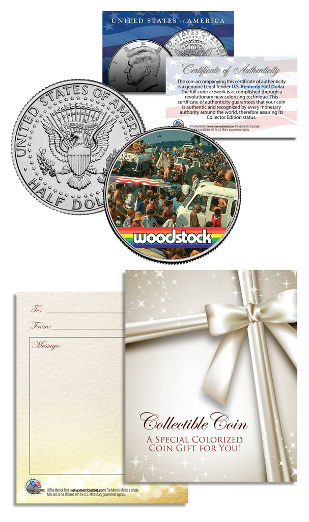 This WOODSTOCK coin is a treasured collectible. Here is your chance to own or gift a beautifully colorized JFK Kennedy Half Dollar U.S. Coin. This high-quality genuine Legal Tender U.S. coin has been colorized using a unique painstaking multicolor authentic process. Colorizing coins involves the unique application of special inks directly to the surface of a coin that achieves a level of detail, color saturation, and durability that is #1 in the coin industry. The result is an everlasting colorized coin collectible of ultra-high quality. Each coin comes in a premium coin capsule with a Certificate of Authenticity to guaranty that your coin is authentic and recognized by every monetary authority around the world, assuring its Collector Edition status. As a bonus, you will also receive an attractive, handy Gift Message Card for you to personalize when giving the coin as a gift.