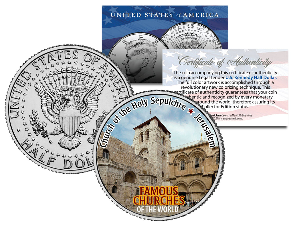 Here is your opportunity to own or gift the FAMOUS CHURCHES OF THE WORLD – CHURCH OF THE HOLY SEPULCHRE – JERUSALEM colorized JFK Kennedy Half Dollar U.S. Coin, which has been enhanced with a beautifully colorized image by the Merrick Mint. Each coin comes in a premium coin capsule with a full color Certificate of Authenticity to guarantee that your coin is authentic and recognized by every monetary authority around the world, assuring its Collector Edition status. This Legal Tender United States coin has been colorized with an application of special inks directly to the surface of the coin, using a unique and painstakingly multicolor coin process, which achieves a level of detail, color saturation, and durability that is #1 in the coin industry. The result is an everlasting colorized coin collectible of ultra-high quality. The Kennedy half dollar is a U.S. fifty cent coin with coin year and mint marks chosen at random.