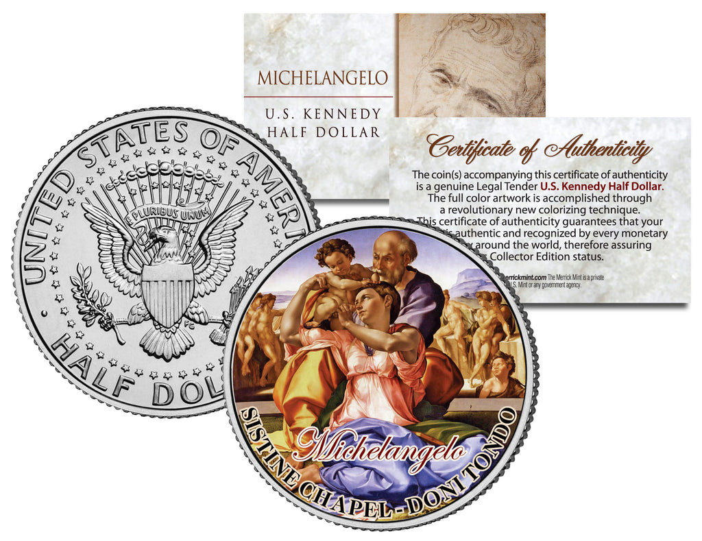 Michelangelo's fresco paintings at the Sistine Chapel changed the course of Western art. Here is your opportunity to own or gift the “MICHELANGELO – SISTINE CHAPEL – DONI TONDO” U.S. colorized JFK Kennedy Half Dollar U.S. Coin, which has been enhanced with a beautifully colorized image by the Merrick Mint. Each coin comes in a premium coin capsule with a full color Certificate of Authenticity to guarantee that your coin is authentic and recognized by every monetary authority around the world, assuring its Collector Edition status. This Legal Tender United States coin has been colorized with an application of special inks directly to the surface of the coin, using a unique and painstakingly multicolor coin process, which achieves a level of detail, color saturation, and durability that is #1 in the coin industry. The result is an everlasting colorized coin collectible of ultra-high quality. The Kennedy half dollar is a U.S. fifty cent coin with coin year and mint marks chosen at random.