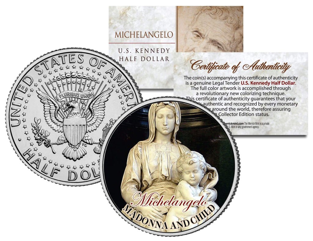 Madonna and Child is a world-famous Renaissance sculpture by Michelangelo housed in the Church of Our Lady in Bruges, Belgium. Here is your opportunity to own or gift the “MICHELANGELO – MADONNA AND CHILD” U.S. colorized JFK Kennedy Half Dollar U.S. Coin, which has been enhanced with a beautifully colorized image by the Merrick Mint. Each coin comes in a premium coin capsule with a full color Certificate of Authenticity to guarantee that your coin is authentic and recognized by every monetary authority around the world, assuring its Collector Edition status. This Legal Tender United States coin has been colorized with an application of special inks directly to the surface of the coin, using a unique and painstakingly multicolor coin process, which achieves a level of detail, color saturation, and durability that is #1 in the coin industry. The result is an everlasting colorized coin collectible of ultra-high quality. The Kennedy half dollar is a U.S. fifty cent coin with coin year and mint marks chosen at random.