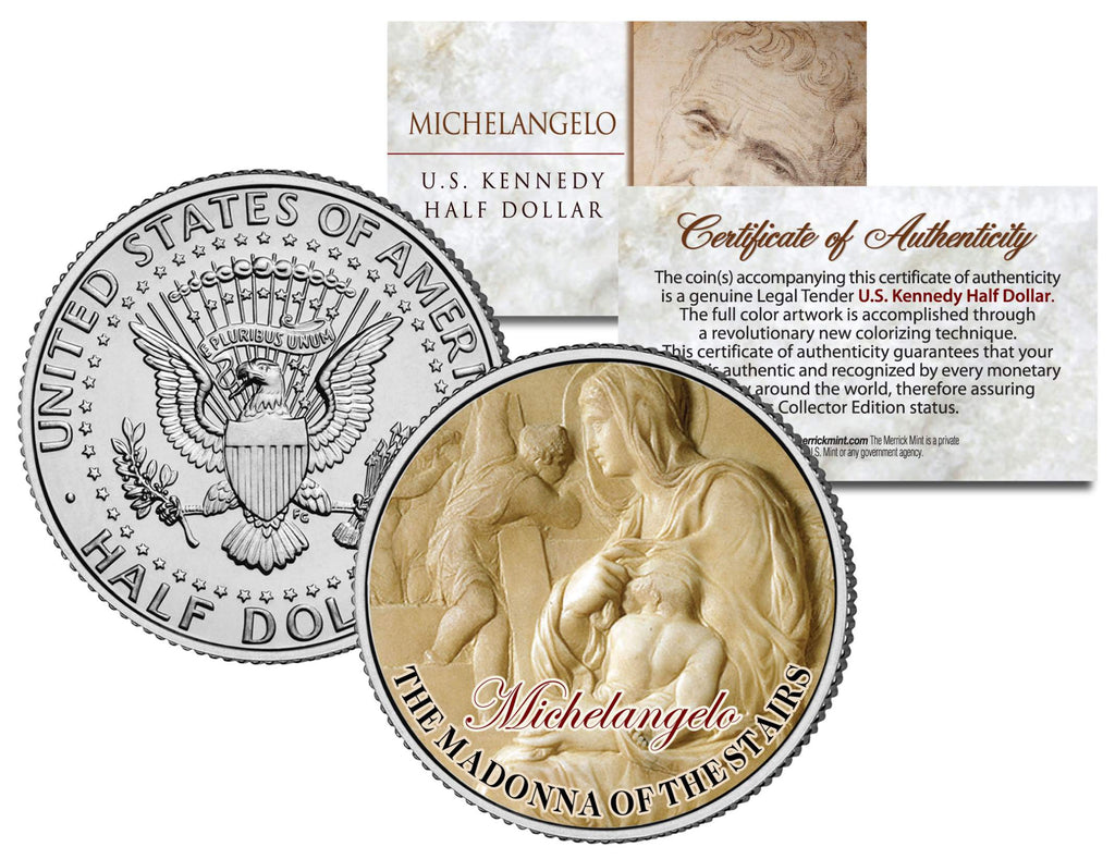 The Madonna of the Stairs is a world-famous Renaissance relief sculpture by Michelangelo housed in Casa Buonarroti museum in Florence, Italy. Here is your opportunity to own or gift the “MICHELANGELO – THE MADONNA OF THE STAIRS” U.S. colorized JFK Kennedy Half Dollar U.S. Coin, which has been enhanced with a beautifully colorized image by the Merrick Mint. Each coin comes in a premium coin capsule with a full color Certificate of Authenticity to guarantee that your coin is authentic and recognized by every monetary authority around the world, assuring its Collector Edition status. This Legal Tender United States coin has been colorized with an application of special inks directly to the surface of the coin, using a unique and painstakingly multicolor coin process, which achieves a level of detail, color saturation, and durability that is #1 in the coin industry. The result is an everlasting colorized coin collectible of ultra-high quality. The Kennedy half dollar is a U.S. fifty cent coin with coin year and mint marks chosen at random.