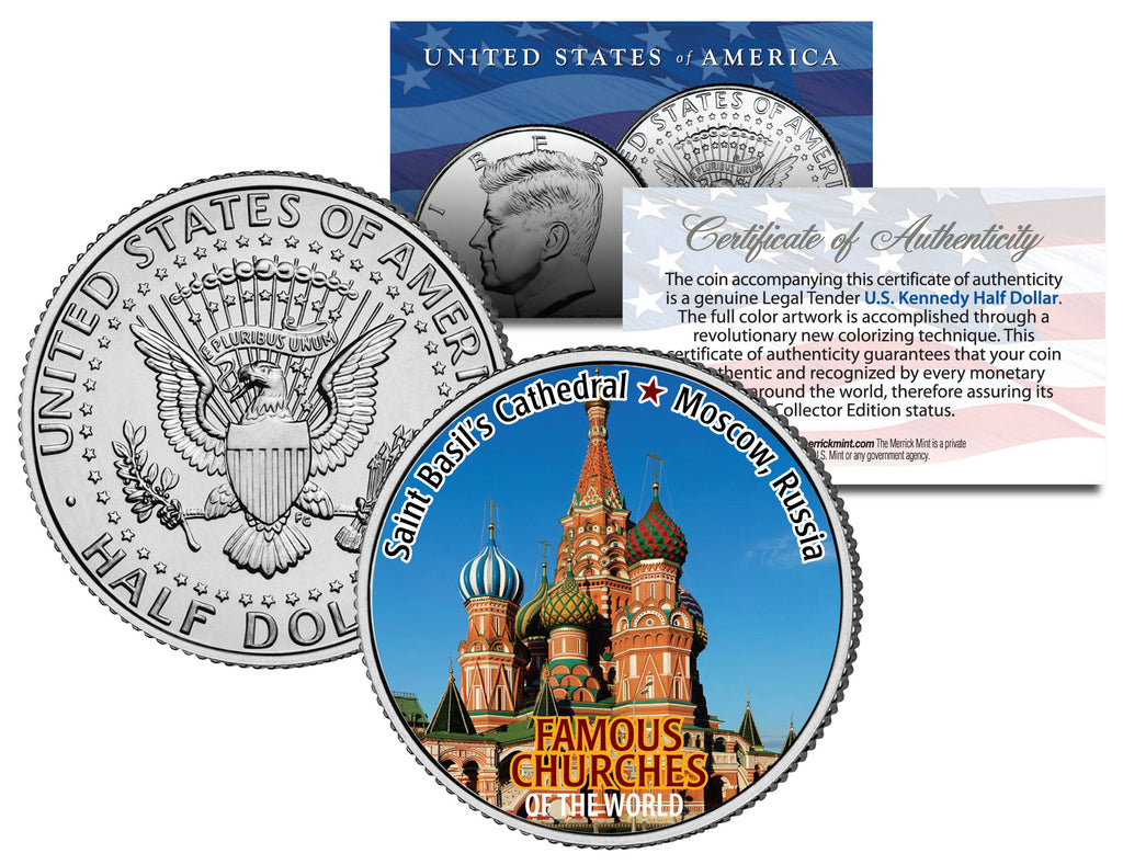 Here is your opportunity to own or gift the FAMOUS CHURCHES OF THE WORLD – SAINT BASIL’S CATHEDRAL – MOSCOW, RUSSIA colorized JFK Kennedy Half Dollar U.S. Coin, which has been enhanced with a beautifully colorized image by the Merrick Mint. Each coin comes in a premium coin capsule with a full color Certificate of Authenticity to guarantee that your coin is authentic and recognized by every monetary authority around the world, assuring its Collector Edition status. This Legal Tender United States coin has been colorized with an application of special inks directly to the surface of the coin, using a unique and painstakingly multicolor coin process, which achieves a level of detail, color saturation, and durability that is #1 in the coin industry. The result is an everlasting colorized coin collectible of ultra-high quality. The Kennedy half dollar is a U.S. fifty cent coin with coin year and mint marks chosen at random.