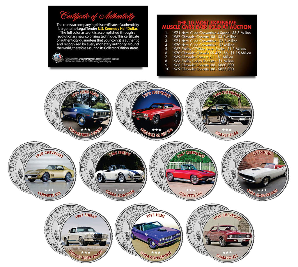 Here is your chance to own a complete set of ten (10) colorized JFK Kennedy Half Dollar U.S. Coins of the 10 MOST EXPENSIVE MUSCLE CARS EVER SOLD AT AUCTION. These high-quality, genuine Legal Tender United States coins have been colorized using a unique painstaking multicolor authentic process by the Merrick Mint. Colorizing coins involves the unique application of special inks directly to the surface of a coin that achieves a level of detail, color saturation, and durability that is #1 in the coin industry. The result is an everlasting colorized coin collectible of ultra-high quality. Each coin comes in a premium coin capsule. The 10-coin set comes with a Certificate of Authenticity to guarantee that your coins are authentic and recognized by every monetary authority around the world, assuring its Collector Edition status. The Kennedy half dollar is a U.S. fifty cent coin with coin year and mint marks chosen at random.