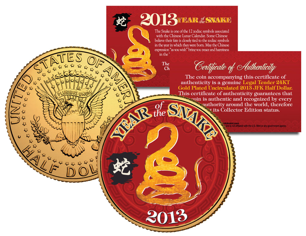 This CHINESE NEW YEAR 2013 – YEAR OF THE SNAKE COIN is lucky money and a treasured collectible. Here is your chance to own or gift a beautifully colorized 24KT Gold Plated JFK Kennedy Half Dollar U.S. Coin. This high-quality genuine Legal Tender U.S. coin has been has been layered in Genuine 24 Karat Gold, and then enhanced with beautiful colorized images using a unique painstaking multicolor authentic process. Colorizing coins involves the unique application of special inks directly to the surface of a coin that achieves a level of detail, color saturation, and durability that is #1 in the coin industry. The result is an everlasting colorized coin collectible of ultra-high quality. Each coin comes in a premium coin capsule with a Certificate of Authenticity to guaranty that your coin is authentic and recognized by every monetary authority around the world, assuring its Collector Edition status.