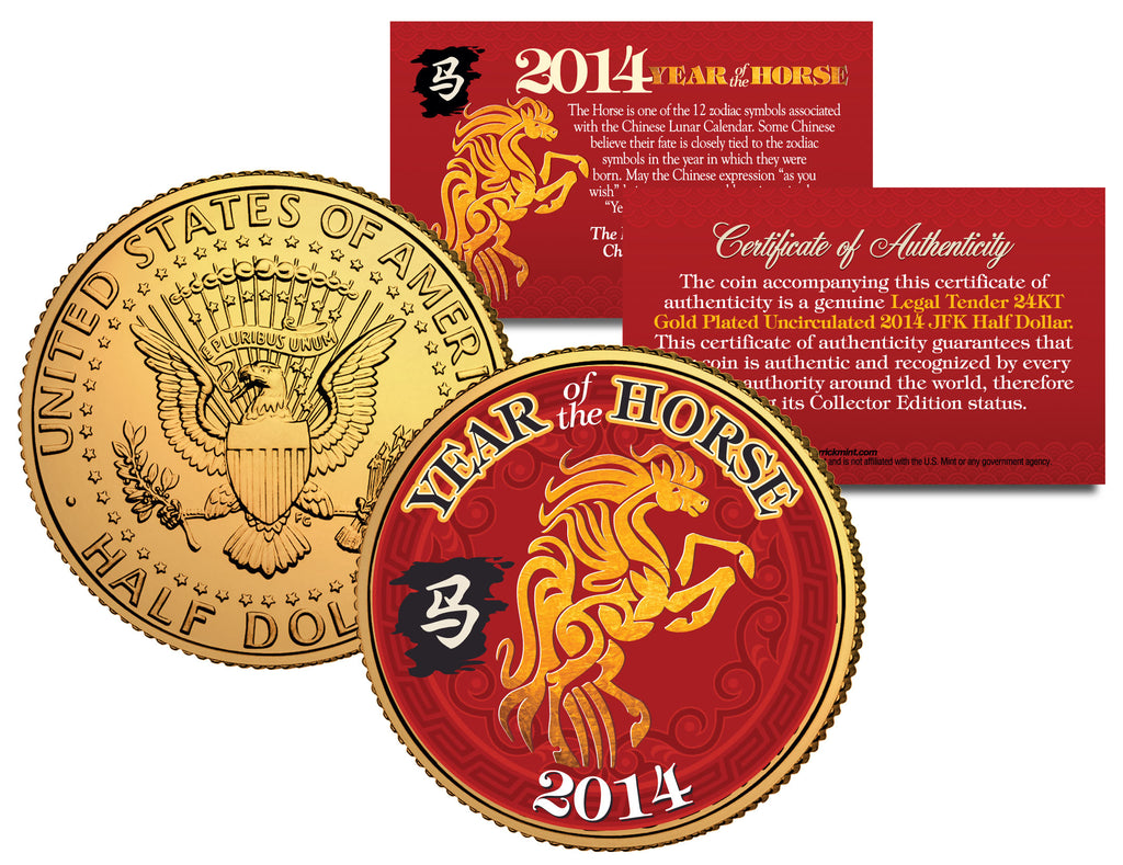 This CHINESE NEW YEAR 2014 – YEAR OF THE HORSE COIN is lucky money and a treasured collectible. Here is your chance to own or gift a beautifully colorized 24KT Gold Plated JFK Kennedy Half Dollar U.S. Coin. This high-quality genuine Legal Tender U.S. coin has been has been layered in Genuine 24 Karat Gold, and then enhanced with beautiful colorized images using a unique painstaking multicolor authentic process. Colorizing coins involves the unique application of special inks directly to the surface of a coin that achieves a level of detail, color saturation, and durability that is #1 in the coin industry. The result is an everlasting colorized coin collectible of ultra-high quality. Each coin comes in a premium coin capsule with a Certificate of Authenticity to guaranty that your coin is authentic and recognized by every monetary authority around the world, assuring its Collector Edition status.