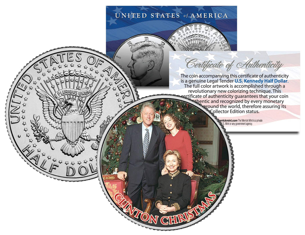Here is your opportunity to own a beautifully colorized JFK Kennedy Half Dollar U.S. Coin featuring a CLINTON CHRISTMAS. Each coin comes in a premium coin capsule with a full color Certificate of Authenticity to guarantee that your coin is authentic and recognized by every monetary authority around the world, assuring its Collector Edition status. This Legal Tender United States coin has been colorized with an application of special inks directly to the surface of the coin, using a unique and painstakingly multicolor coin process, which achieves a level of detail, color saturation, and durability that is #1 in the coin industry. The result is an everlasting colorized coin collectible of ultra-high quality.