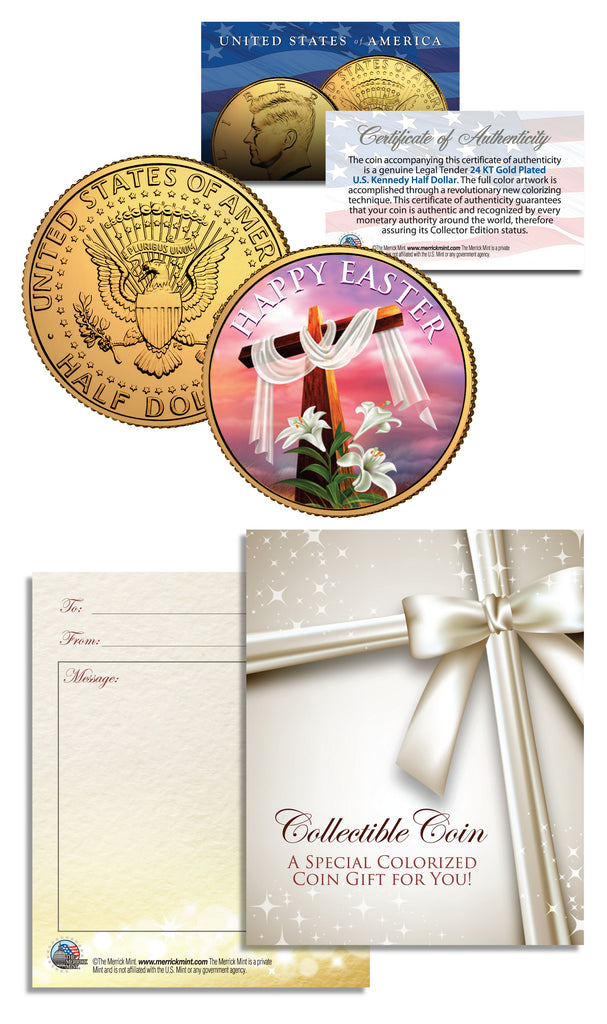 This HAPPY EASTER – RELIGIOUS GIFT coin is a treasured keepsake and collectible. Here is your chance to own or gift a beautifully colorized 24KT Gold Plated JFK Kennedy Half Dollar U.S. Coin. This high-quality genuine Legal Tender U.S. coin has been has been layered in Genuine 24 Karat Gold, and then enhanced with beautiful colorized images using a unique painstaking multicolor authentic process. Colorizing coins involves the unique application of special inks directly to the surface of a coin that achieves a level of detail, color saturation, and durability that is #1 in the coin industry. The result is an everlasting colorized coin collectible of ultra-high quality. Each coin comes in a premium coin capsule with a Certificate of Authenticity to guaranty that your coin is authentic and recognized by every monetary authority around the world, assuring its Collector Edition status.