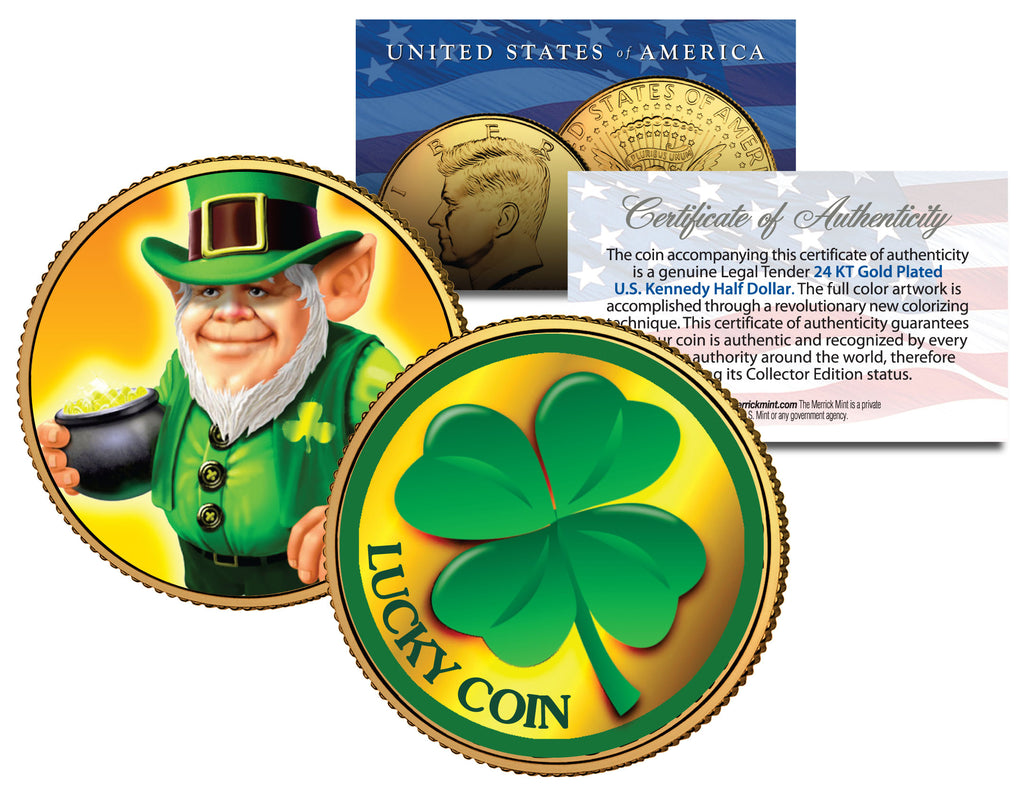 This LEPRECHAUN / FOUR LEAF CLOVER - LUCKY COIN is a good luck charm and treasured collectible. Here is your chance to own or gift a beautifully colorized 24KT Gold Plated JFK Kennedy Half Dollar U.S. Coin. This high-quality genuine Legal Tender U.S. coin has been has been layered in Genuine 24 Karat Gold, and then enhanced with beautiful colorized images using a unique painstaking multicolor authentic process. Colorizing coins involves the unique application of special inks directly to the surface of a coin that achieves a level of detail, color saturation, and durability that is #1 in the coin industry. The result is an everlasting colorized coin collectible of ultra-high quality. Each coin comes in a premium coin capsule with a Certificate of Authenticity to guaranty that your coin is authentic and recognized by every monetary authority around the world, assuring its Collector Edition status.