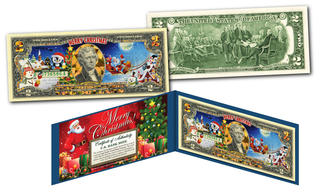 CHRISTMAS XMAS Dual Overlay * Gold Hologram & Polychrome * Genuine Legal Tender US $2 Bill. This MERRY CHRISTMAS uncirculated $2 Bill is Genuine Authentic Legal Tender of the United States, and has been colorized and holographically gold enhanced using specialized advanced technology, by the Merrick Mint. It is the first time ever that Dual overlay's have been used on a Genuine Banknote. Only genuine Legal Tender $2 United States Bills are used for this unique colorization process. Each $2 Bill is in FRESH, CRISP, UNCIRCULATED condition, and was directly removed from untouched wrapped Federal Reserve sealed packs. First Dual Overlay Banknote for the Holidays.