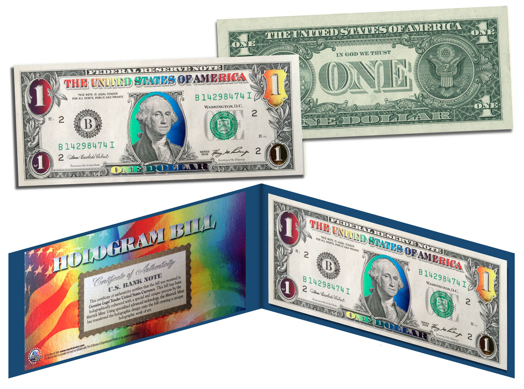 This uncirculated $1 Bill is Genuine Authentic Legal Tender of the United States, which has been holographically enhanced. Using specialized advanced technology, the Merrick Mint has permanently transferred the exclusive DELUXE MULTI-COLOR HOLOGRAM design onto the $1 bill creating a holographic work of art. When the light strikes the hologram, the light reflects in all directions which photography cannot capture. Included is a blue display portfolio plus a Certificate of Authenticity to guaranty that your bills are authentic and recognized by every monetary authority around the world, and assuring its Collector Edition status. Only genuine Legal Tender $1 United States Bills are used for this unique colorization process. Each $1 Bill is in FRESH, CRISP, UNCIRCULATED condition, and was directly removed from untouched wrapped Federal Reserve sealed packs. The first US President, George Washington, is featured on the obverse of the note, along with the special hologram overlay and the Great Seal of the United States is featured on the reverse.
