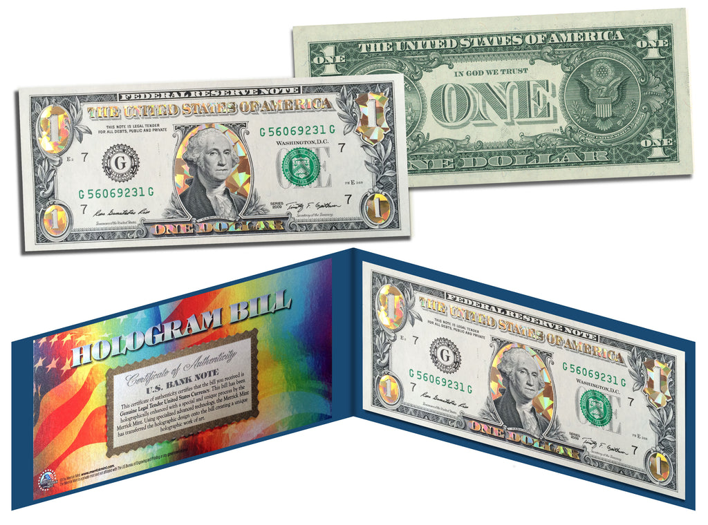 This uncirculated $1 Bill is Genuine Authentic Legal Tender of the United States, which has been holographically enhanced. Using specialized advanced technology, the Merrick Mint has permanently transferred the exclusive DELUXE MULTI-COLOR HOLOGRAM design onto the $1 bill creating a holographic work of art. When the light strikes the hologram, the light reflects in all directions which photography cannot capture. Included is a blue display portfolio plus a Certificate of Authenticity to guaranty that your bills are authentic and recognized by every monetary authority around the world, and assuring its Collector Edition status. Only genuine Legal Tender $1 United States Bills are used for this unique colorization process. Each $1 Bill is in FRESH, CRISP, UNCIRCULATED condition, and was directly removed from untouched wrapped Federal Reserve sealed packs. The first US President, George Washington, is featured on the obverse of the note, along with the special hologram overlay and the Great Seal of the United States is featured on the reverse.